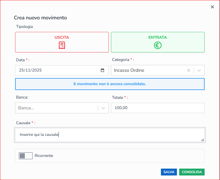 Cliccando su “Consolida” il movimento verrà considerato come “consolidato” (pagato).