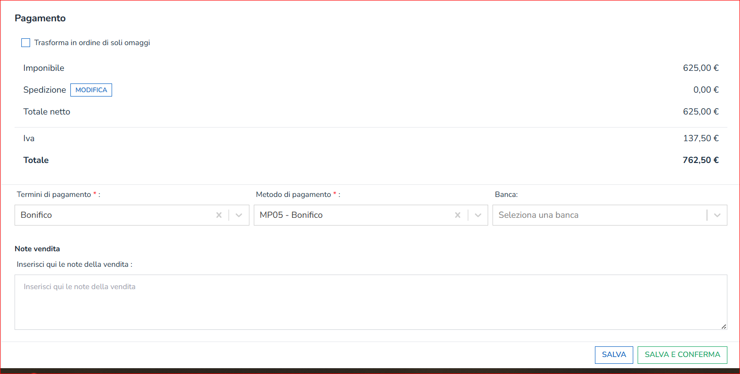 Per completare la creazione, la conferma e l’invio della vendita cliccare su SALVA E CONFERMA