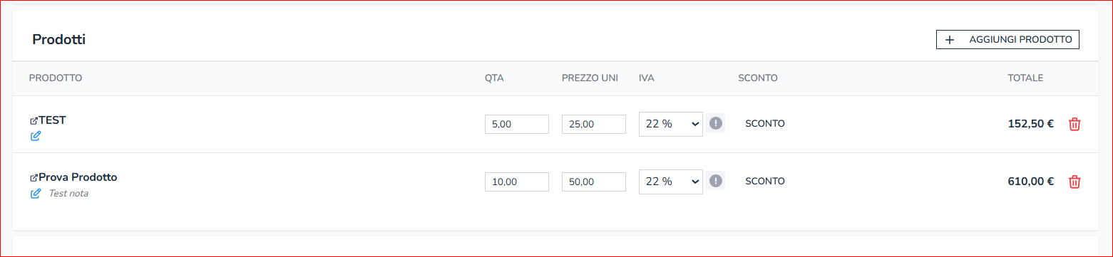 Una volta aggiunti i prodotti all’ordine sarà possibile modificare le Quantità, inserire un prezzo personalizzato, modificare l’aliquota IVA con relativa Natura, inserire uno sconto o rimuovere una linea d’ordine.
