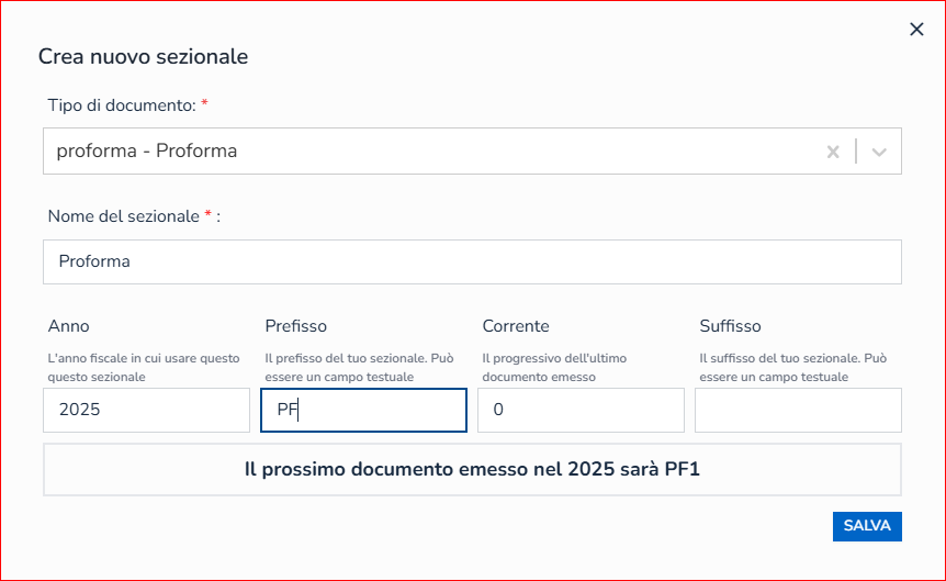 Sono presenti dei sezionali creati di default dal sistema, è possibile personalizzare i sezionali per il proprio profilo, creare diversi progressivi per la stessa tipologia di documento (ad esempio i preventivi). Per farlo cliccare su “+ CREA SEZIONALE” in alto a destra.