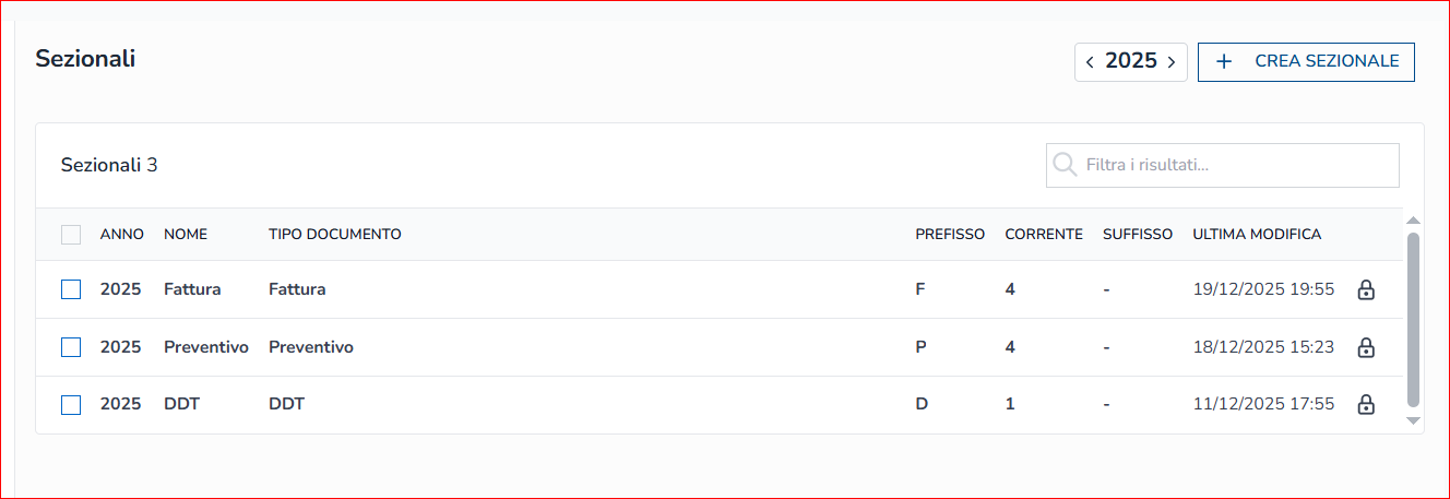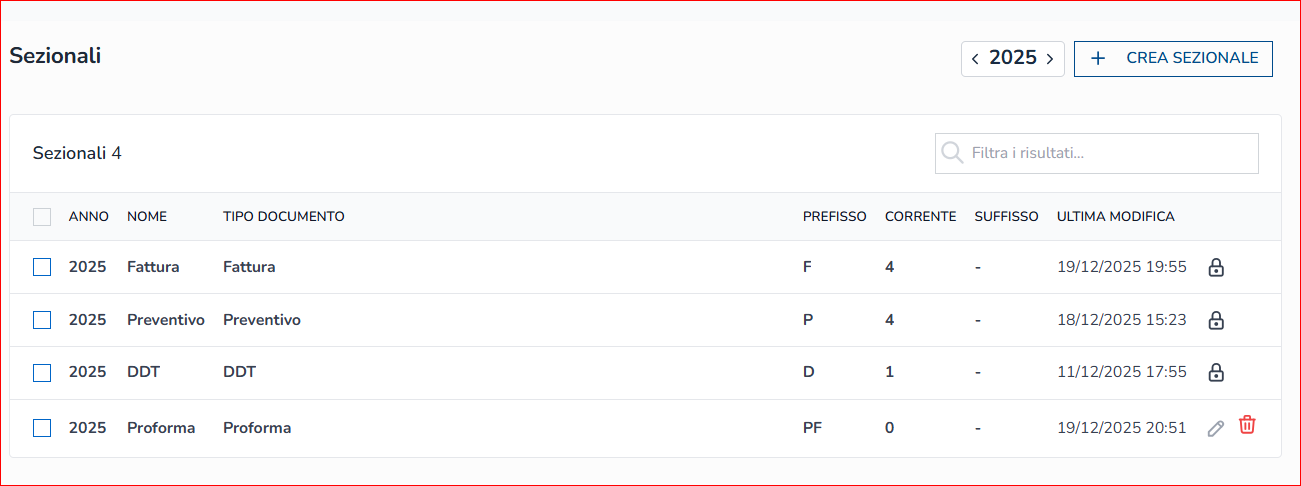 Attenzione: non sarà possibile cancellare un sezionale creato se è già stato utilizzato nel sistema o se è l’ultimo rimasto per quella tipologia di documento. Deve essere sempre presente almeno 1 sezionale per ogni tipologia di documento.