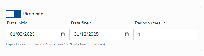 Inserire una data di inizio e una data di fine, quindi l’occorrenza della scadenza personalizzata esprimibile in mesi. In questo caso saranno create 5 occorrenze, una per mese, partendo dalla data di inizio.