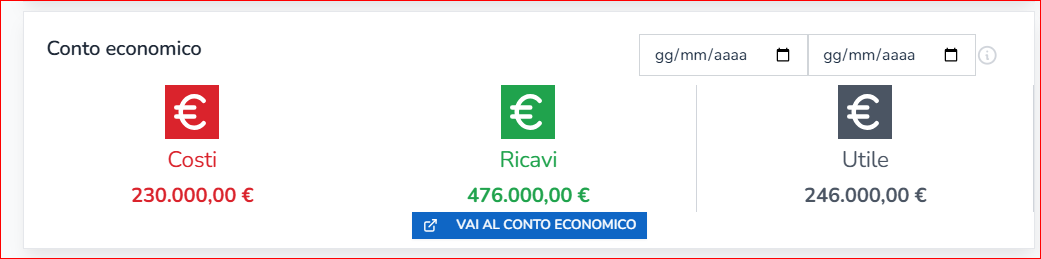 Il widget del conto economico invece mostra l’andamento tra costi e ricavi nell’anno in corso. E’ possibile utilizzare il filtro data in alto per definire un periodo diverso da filtrare.