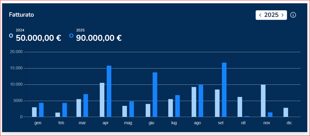 In alto disponibile una panoramica del fatturato dell’anno precedente e di quello dell’anno in corso, consentendo di valutare facilmente l’andamento del fatturato.