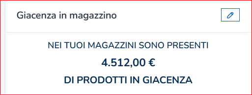 In situazione è possibile visualizzare l’attuale giacenza in magazzino dei prodotti in base alle quantità presenti in magazzino moltiplicato il prezzo di vendita. E’ possibile modificare manualmente la giacenza in magazzino utilizzando l’icona a matita e inserendo un importo. Attenzione: la modifica non è reversibile
