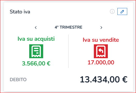 Il widget Stato iva permette di visualizzare l’iva su acquisti e vendite per mese o per trimestre. E’ possibile modificare  l’impostazione di visualizzazione standard da trimestrale a mensile dall’icona a matita.